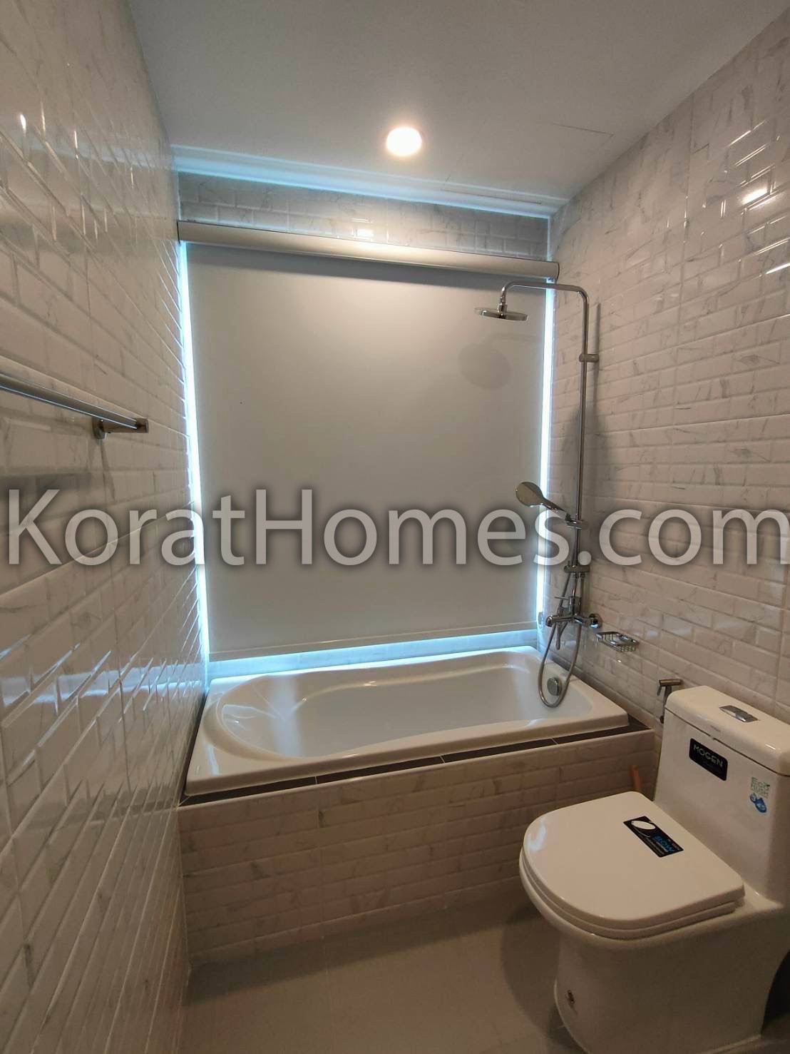 A 55″ UHD Haier Tv with a sound bar, Refrigerator, full kitchen with microwave, Two bathrooms with water heaters. Bathroom has a bathtub with a large window, all windows are covered with a blue protective film for better insulation, wooden floors throughout, wallpapered throughout, wardrobes with built in lighting